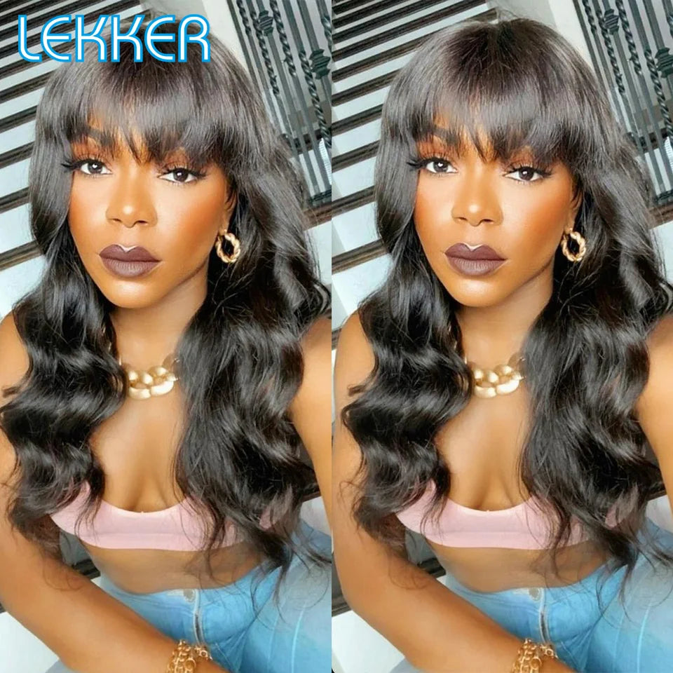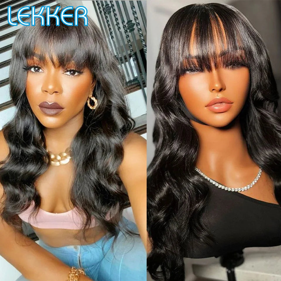 A Lekker-Perruque Brésilienne Naturelle Remy avec Frange pour Femme, Cheveux Longs Ondulés, Sans Colle