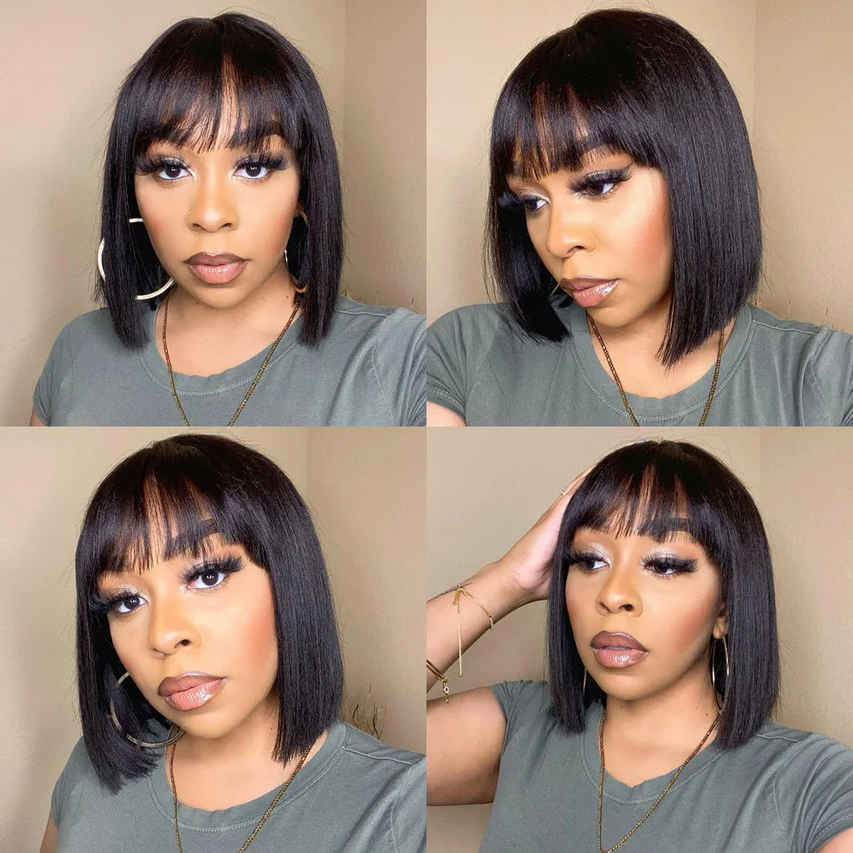 A Perruque de Cheveux Humains Courts et Lisses avec Frange, Sans Colle, Prêt à vitation, Fait à la Machine